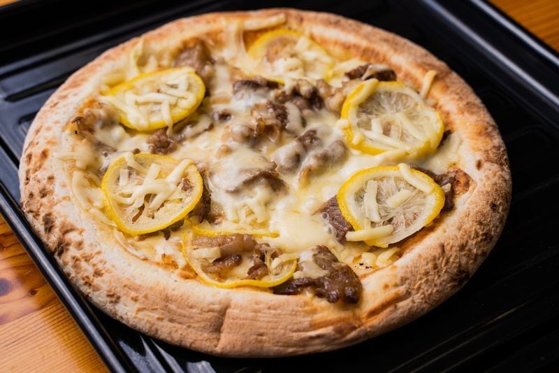 〇レモンステーキピザ:ナポリクラスト(小麦粉、ぶどう糖、食塩、植物油脂、イースト、モルトエキス)、ナチュラルチーズ、牛肉(鹿児島県産)、レモン、玉葱、レモンたれ(還元水あめ、食塩、白ワイン、玉葱、にんにく加工品、醸造酢、マスタード、レモン果汁、チキンエキス、レモンピール、胡椒)、和風ソース(醤油、砂糖、米発酵調味料、食塩、魚醤、麦芽エキス、酵母エキス、魚介エキス)、味醂(もち米(タイ産)、米(国産)、米麹、醸造アルコール、糖類)/増粘剤(加工澱粉、キサンタン)、セルロース、酒精、pH調整剤、香料、酸化防止剤(ビタミンC)、調味料(アミノ酸等)、酸味料、カラメル色素、(一部に小麦・乳成分・大豆・牛肉・鶏肉を含む)